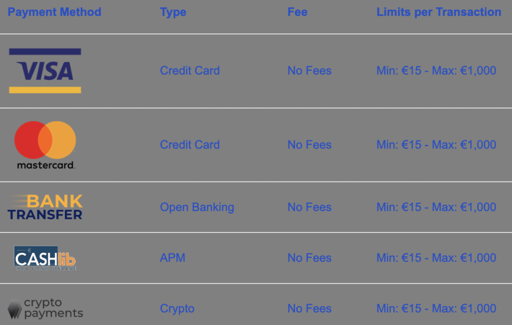 | APM | Alternative Payment Method (APM) | No Fees | Min: €15 – Max: €1,000 |