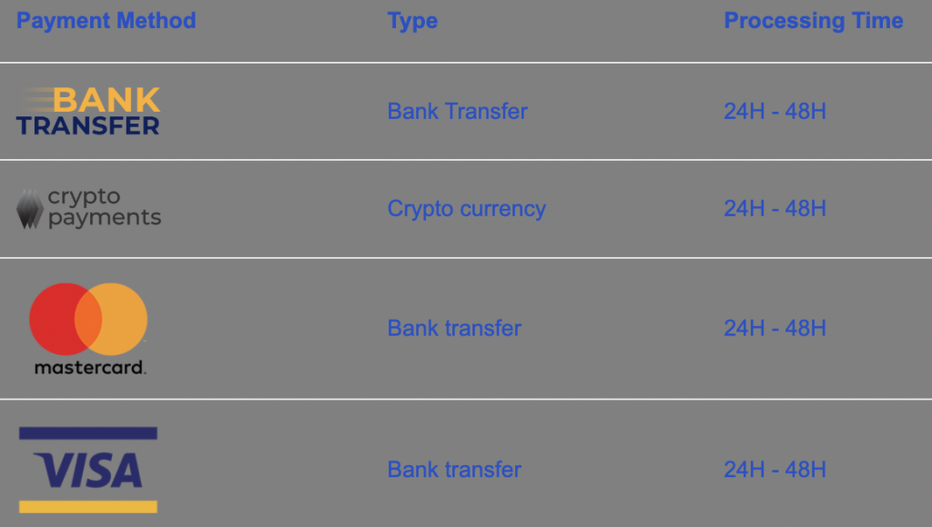 | Bank Transfer | Bank Transfer | 24H – 48H |
